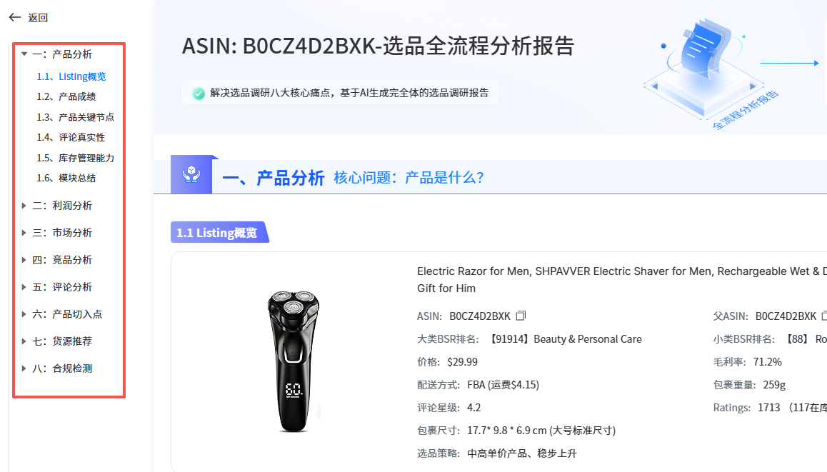 首先输入你想要调研的Asin,它就会从8个维度帮你做一份选品报告的PPT,这8个维度包括产品分析、利润分析、市场分析、竞品分析、评论分析、产品切入点、货源推荐和合规检测。