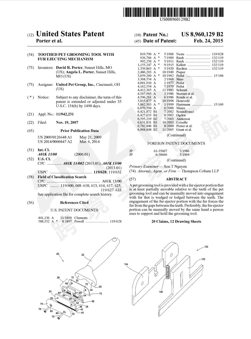 原告Spectrum Brands, Inc.是一家全球性的消费品公司,其产品领域广泛,包括剃须和美容产品、个人护理产品、专业宠物用品、草坪及花园和家庭害虫控制产品、个人驱虫剂等。该公司旗下拥有多个知名品牌,其中包括Rayovac、Remington、George Foreman和Black & Decker Home等。本次案件涉及的是一款由FURminator制造的脱毛工具,该品牌在2011年被Spectrum Brands收购,并随之包括了FURminator的所有知识产权。涉案专利的专利号为US 8,960,129 B2,于2015年2月24日获得批准。这款脱毛工具是专为小型犬(体重低于25磅的狗)设计的,它能够轻松穿过上层毛发,安全有效地去除脱落的毛发和底毛,同时避免对宠物的毛发造成伤害或割伤其皮肤。同时,工具边缘的弯曲设计使其能够顺滑地滑过狗的皮肤,防止边缘凹陷,并符合宠物的自然体型和形状。而符合人体工程学的手柄也使去毛过程变得简单。