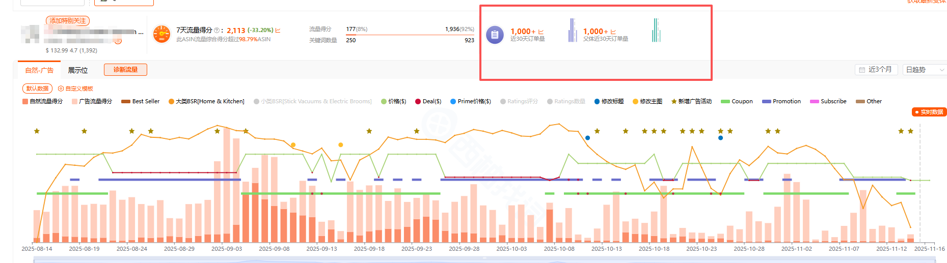 分析链接自然流量与广告流量占比,计算出来自然订单与广告订单占比,此处只能借助工具进行大概的数据分析,目前亚马逊官方好像没有明确数据可以用于预估