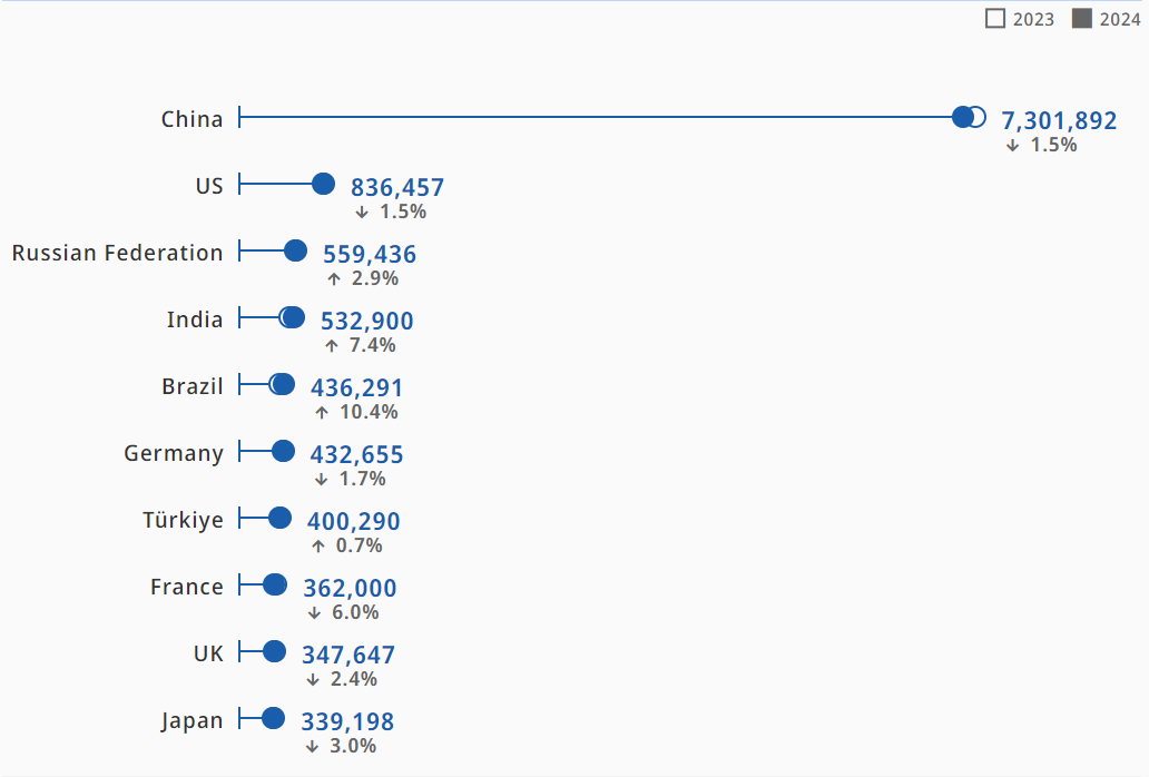 申请量最大的是中国申请人,其国内外申请类别总数约达730 万件;其次为美国申请人( 836,457 件)、俄罗斯联邦申请人( 559,436 件)、印度申请人( 532,900 件)和巴西申请人( 436,291 件)。在前五大来源国中,巴西( +10.4% )、印度( +7.4% )和俄罗斯联邦( +2.9% ) 2024 年申请量实现增长,而中国和美国均下降 1.5% 。巴西增长源于境内外申请量同步提升,印度与俄罗斯联邦的增长则完全由境内申请量增加驱动。