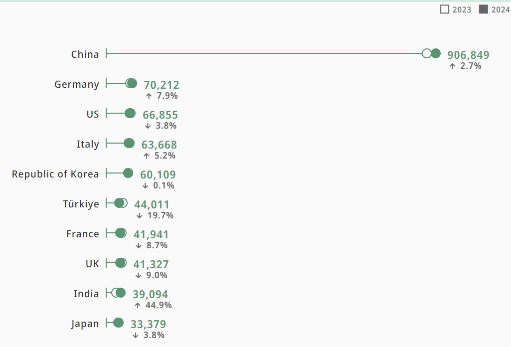 在前五大来源国中,德国(+7.9% ) 2024 年申请量增速最快,意大利( +5.2% )和中国( +2.7% )紧随其后。相比之下,美国( -3.8% )和大韩民国( -0.1% )出现下滑。