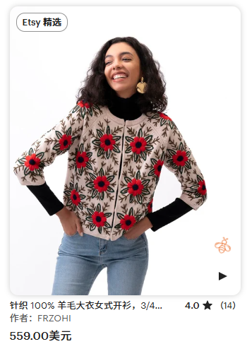 Etsy平台上,一件印花毛衣卖559美元,溢价超10倍以上,卖家可以自主添加有个性的文字或图案,来满足自己的独特性。