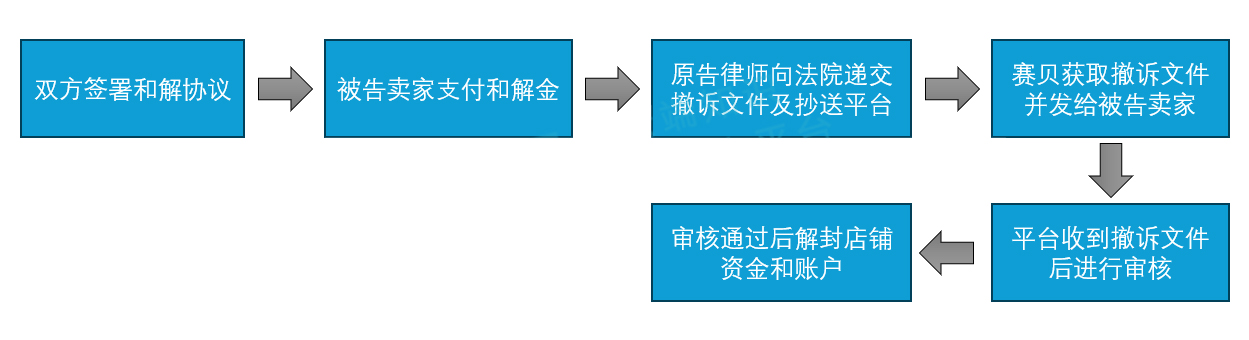 双方签署和解协议 → 被告卖家支付和解金 → 原告律师向法院递交撤诉文件及抄送平台 → 赛贝获取撤诉文件并发给被告卖家 → 平台收到撤诉文件后进行审核 → 审核通过后解封店铺资金和账户